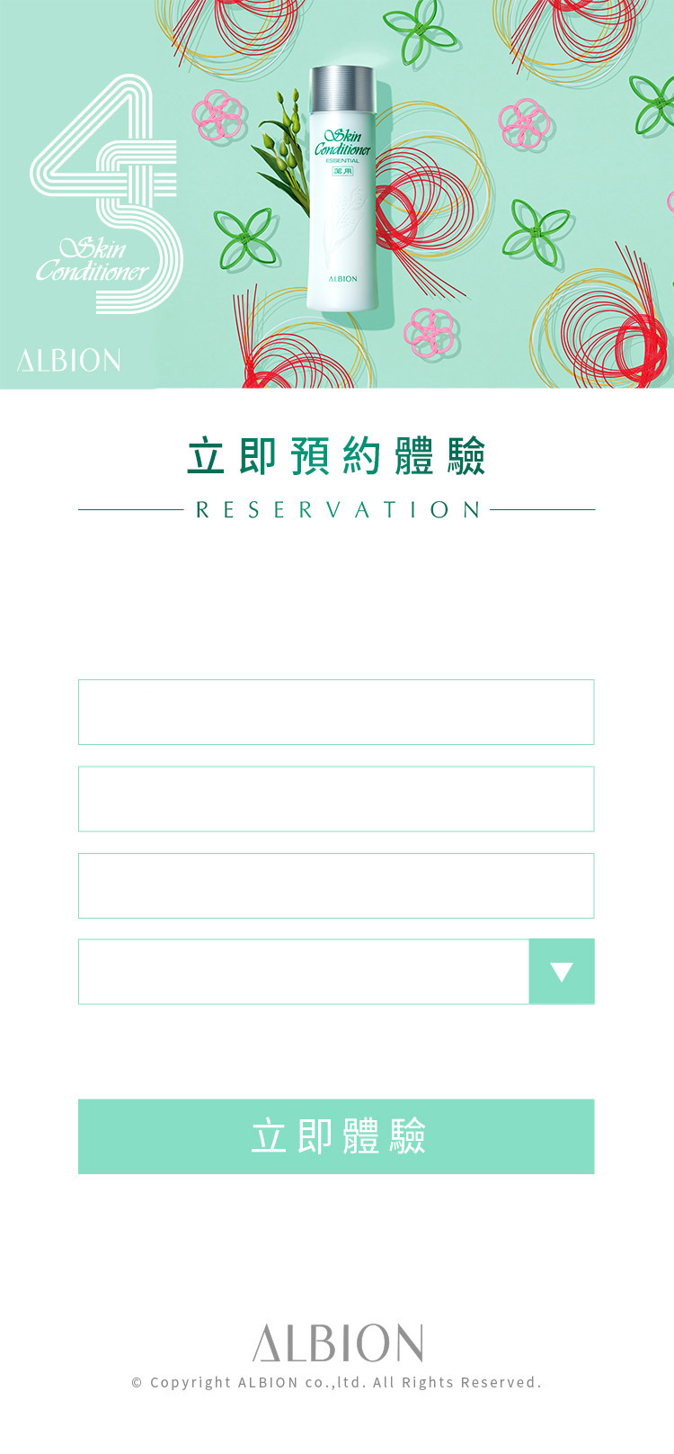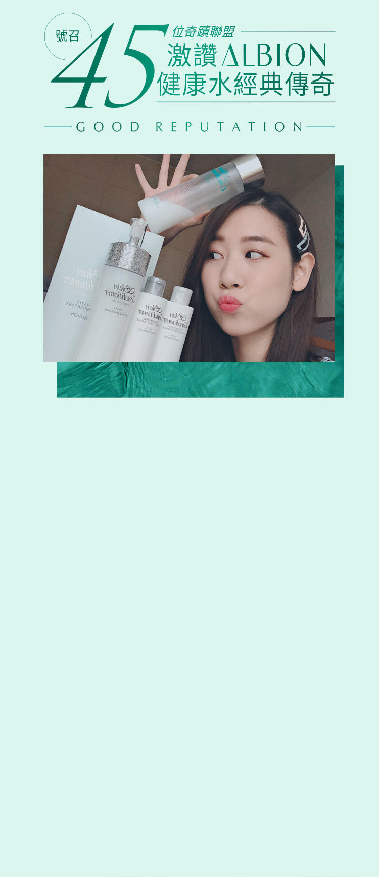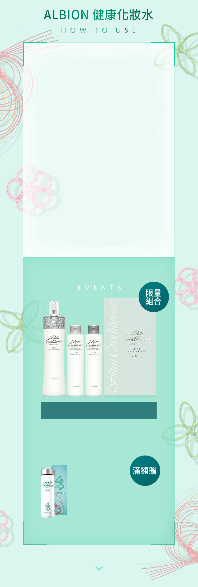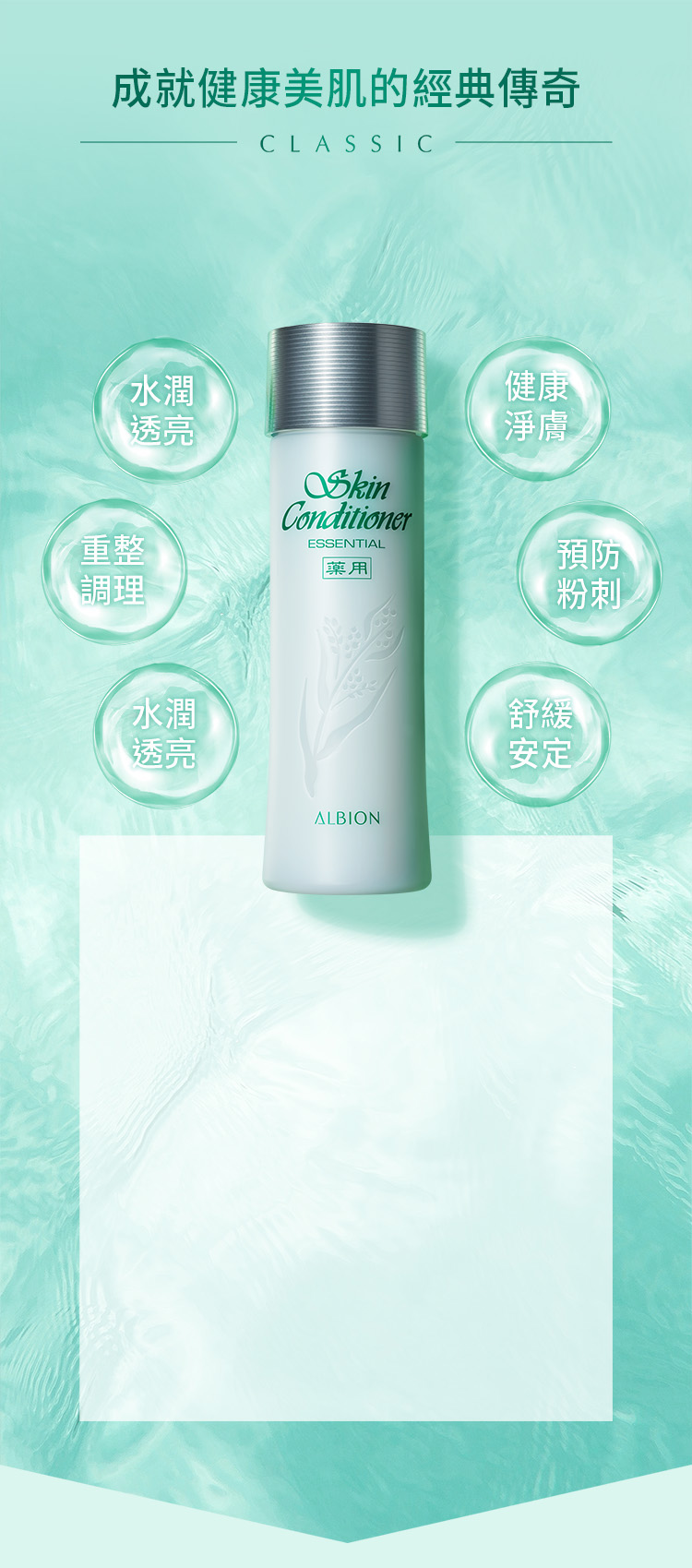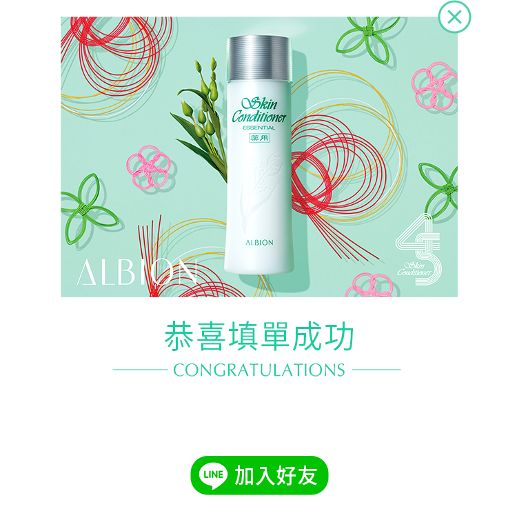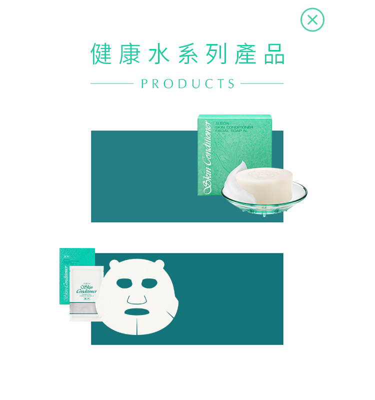 肌膚清潔後,使用滲透乳柔軟角質。接著使用健康化妝水,取約一茶匙的量於ALBION按摩化妝棉上,由臉部中央朝外側輕拍,由下至上托著肌膚輕輕拍打至均勻水潤